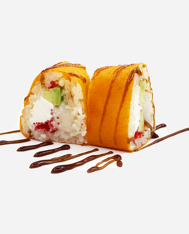 Гребешок, авокадо, сливочный сыр, масаго, соус спайси, соус унаги